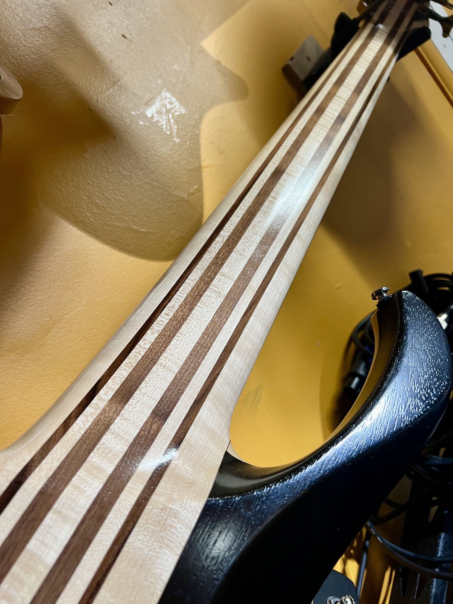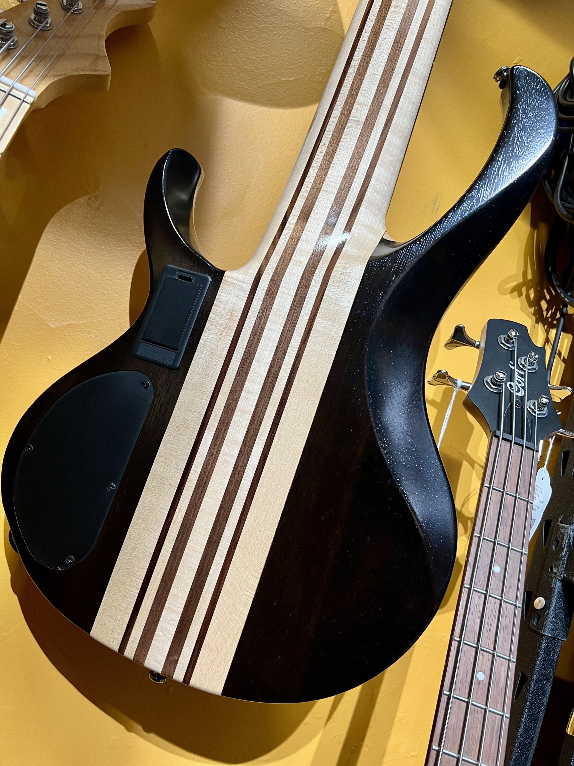 Tonewoods include a 9-piece maple, walnut, and panga panga neck with walnut-topped/Okoume-backed ash wings