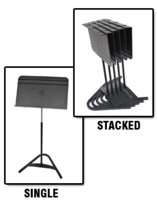 The Harmony Stands’ V-Shaped Bases Conveniently Stack In An Incredibly Small Amount Of Floor Space. As Their Bases Stack Together So Tightly, It Takes Only Six Feet To Store 25 Stands, And 50 Stands Can Be Stored In About 10 Linear Feet Of Space. The Harmony Stand Comes With An Extremely Durable Abs Plastic Desk, But Can Also Be Purchased With The Traditional Manhasset Aluminum Desk, If Desired.