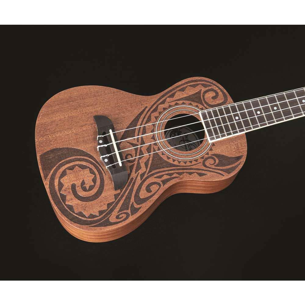 This handcrafted Uke /ukulele boasts a mahogany top, back, and sides, all finished in satin, accentuated with a laser-etched traditional Hawaiian Tattoo design for a unique aesthetic. The attention to detail extends to its Rosetek Bridge and fingerboards, complemented by chrome tuners, ensuring both visual beauty and functional reliability.