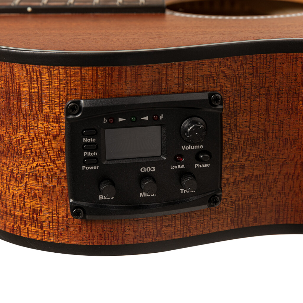 Equipped with an under-saddle transducer and preamp system, it features EQ controls (bass, middle, treble), master volume, built-in chromatic tuner, phase switch, and low battery indicator—giving you full control over your amplified sound.